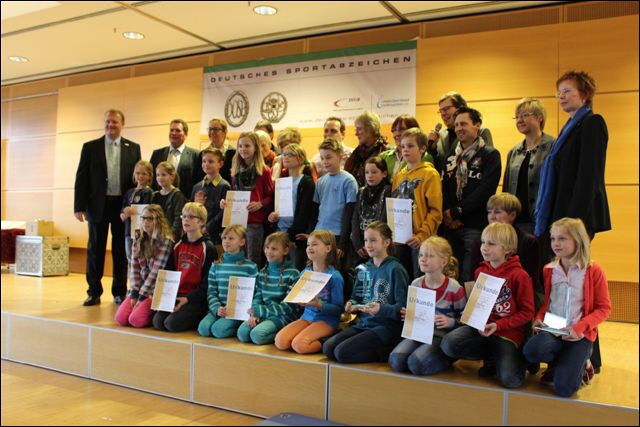 Am 22.08.2013 wurden wir im Rahmen der Sportabzeichen-Prämierung ausgezeichnet und mit einem Scheck über 150,00 EUR belohnt. Mit 79,4 Prozent der Grundschüler der Grundschule hatten wir den höchsten Anteil an Kindern, die erfolgreich das Sportabzeichen absolviert haben. Vielen Dank an die Sponsoren! |