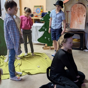 Musikprojekt (07.Oktober 2022): "Monsieur Jacques erzählt" - eine besondere Musikstunde über verschiedene Streichinstrumente. Julia Veto, Carla Linné und Alexandra Varela haben uns die Geschichte von Monsieur Jacques in einem Puppenspiel erzählt und dabei verschiedene Streichinstrumente (Geige, Viola da Gamba und Cello) vorgeführt.